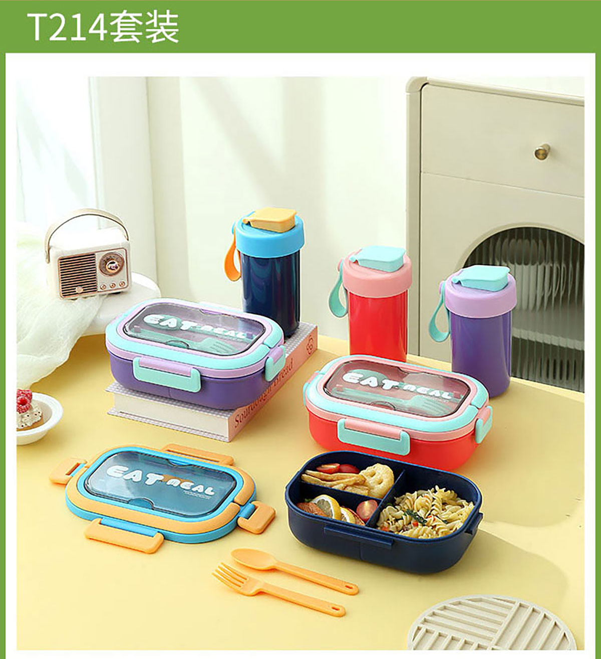 SWY-T214(套裝款):飯盒:215*149*71mm/1000ml 水壺:直徑8.2*高16.1/480ml